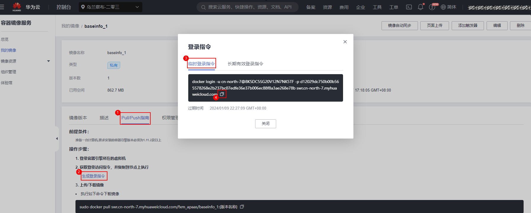 - 返回华为云容器镜像服务控制台镜像列表中单击镜像tar包名称,进入镜像详情页面,选择“pull/push指南”页签,单击“操作步骤”中的“生成登录指令”。