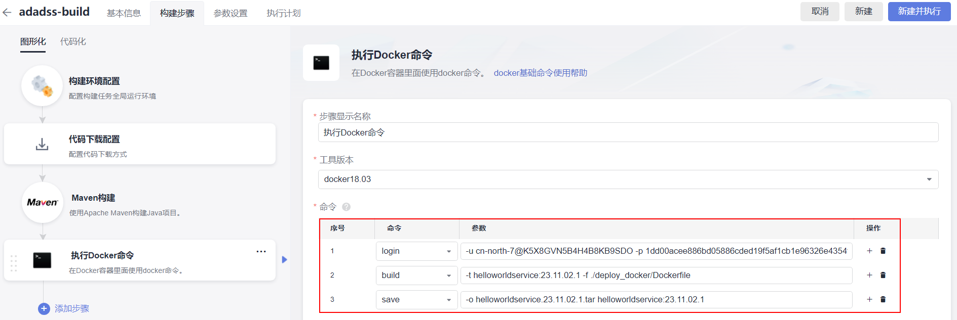 - 在“操作”列单击“ ”继续添加docker命令,“命令”下拉框中选择“build”,并在参数框中输入命令,指定代码仓中的dockerfile文件并构建镜像。