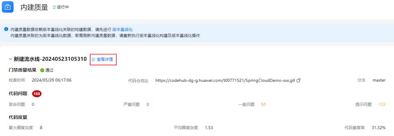 - 在“内建质量”页面,可查看到当前服务版本基线化后的流水线代码检查执行结果,如图1所示,单击代码检查任务名称右侧“查看详情”,进入“检查任务详情”页面可查看更多检查详情信息。