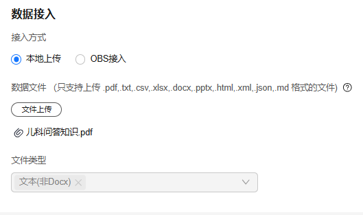 在“数据接入”区域,通过“本地上传”的方式上传儿科问答知识.pdf,如图3所示。
