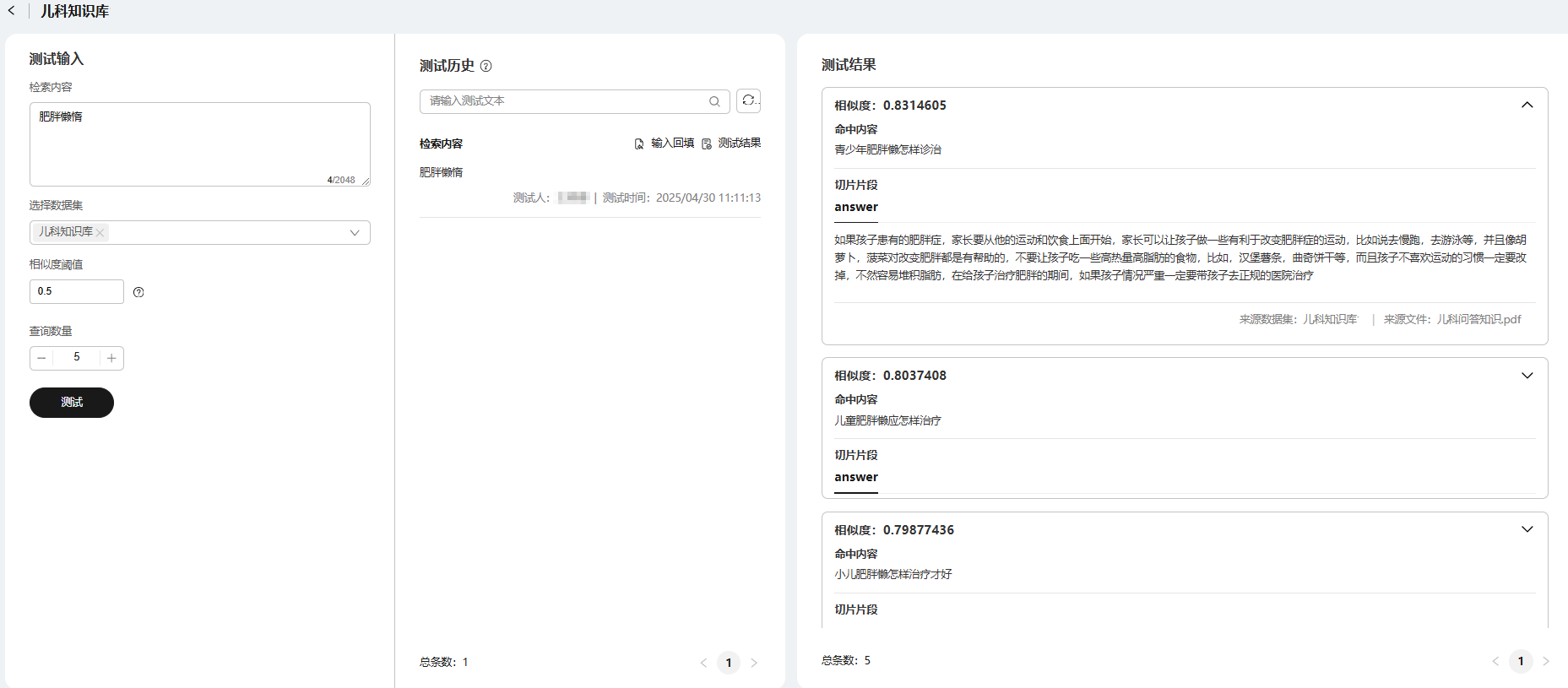- 在“测试结果”区域查看测试效果,测试结果根据相似度从大到小进行排序。
