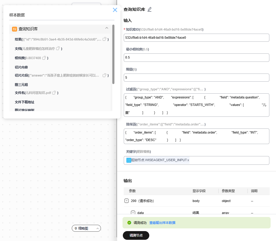- 在查询知识库节点的参数配置面板中,单击“调测节点”,可以看到查询结果为过滤并排序后的信息,如图8所示。