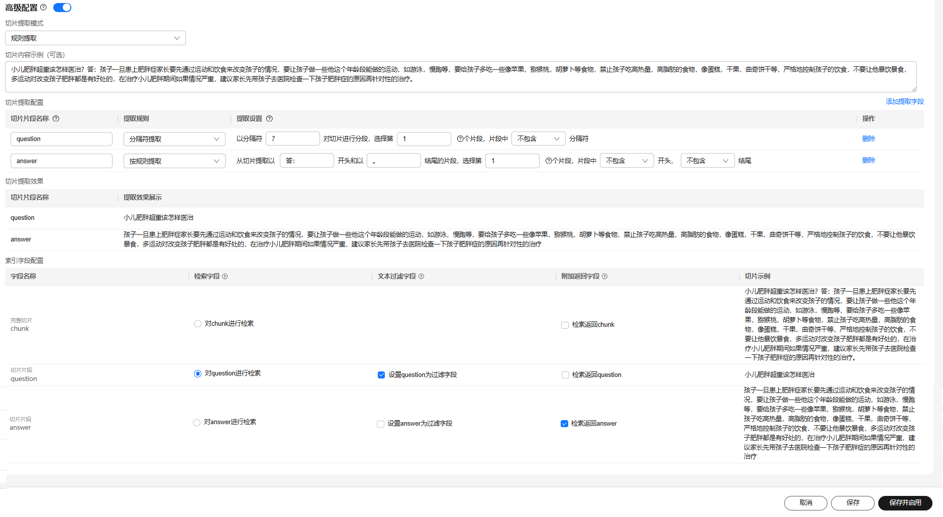 - 附加返回字段:勾选“检索返回answer”,表示在检索时,附加返回answer字段的内容。