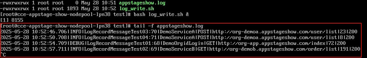 - 执行如下命令,确认日志文件是否可以正常输出,显示如图1所示表示日志文件正常输出,预置业务日志脚本完成。
