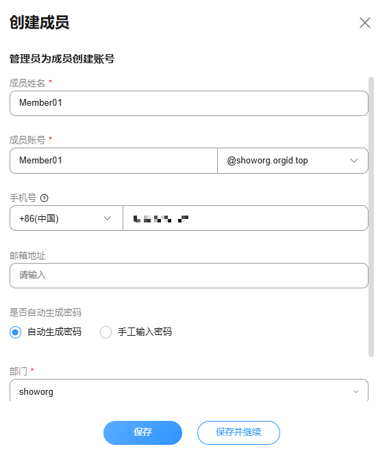 设置成员的账号密码,支持选择“自动生成密码”或“手工输入密码”。