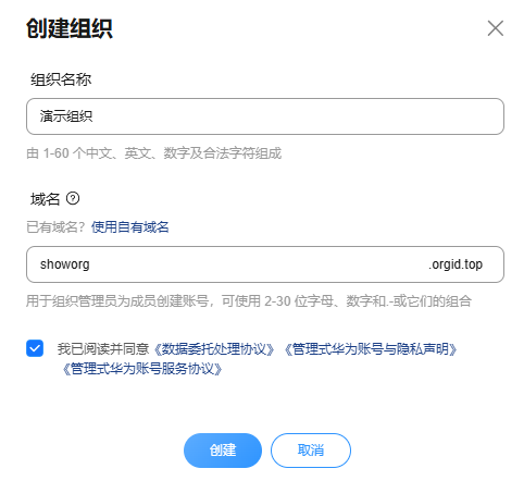 - 购买运维中心后跳转到appstagej9九游会登录首页,系统提示您未创建组织,待提示框关闭后,在“创建组织”弹框中参考表1配置组织信息。