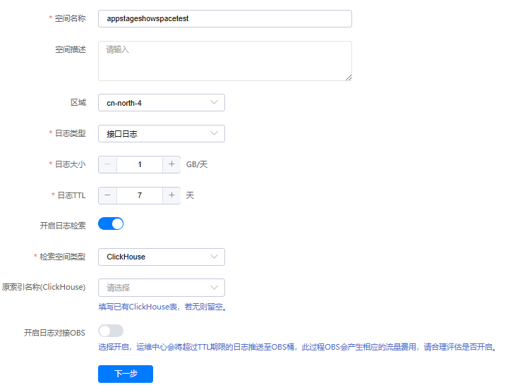 - 配置实时日志空间信息,如图2所示,参数说明如表3所示,配置完成后,单击“下一步”。