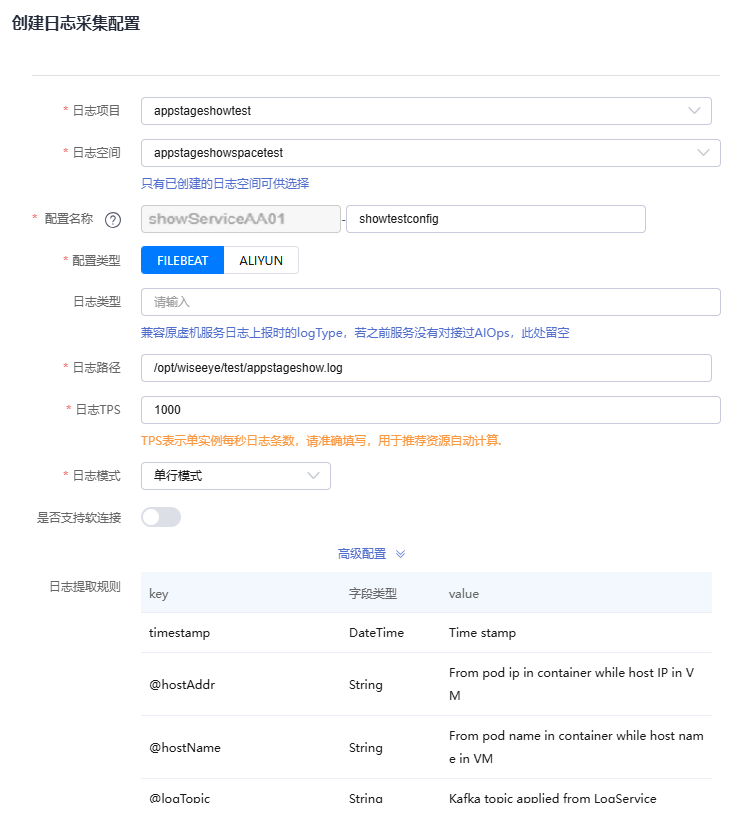 - 如果采集路径配置了通配符,则将采集的日志tps累加,累加计算高峰期单台机器(pod)的tps,建议按近期业务增长预期填写。