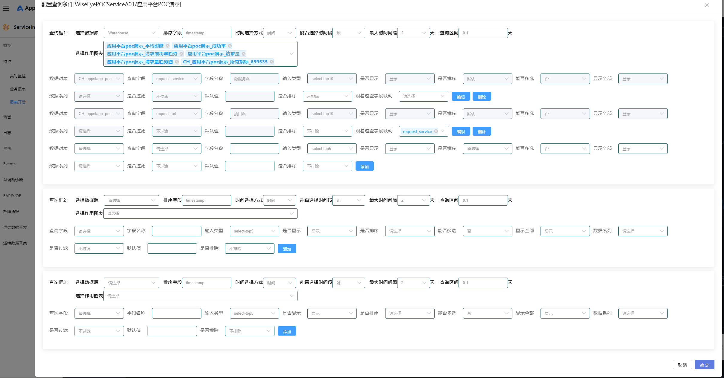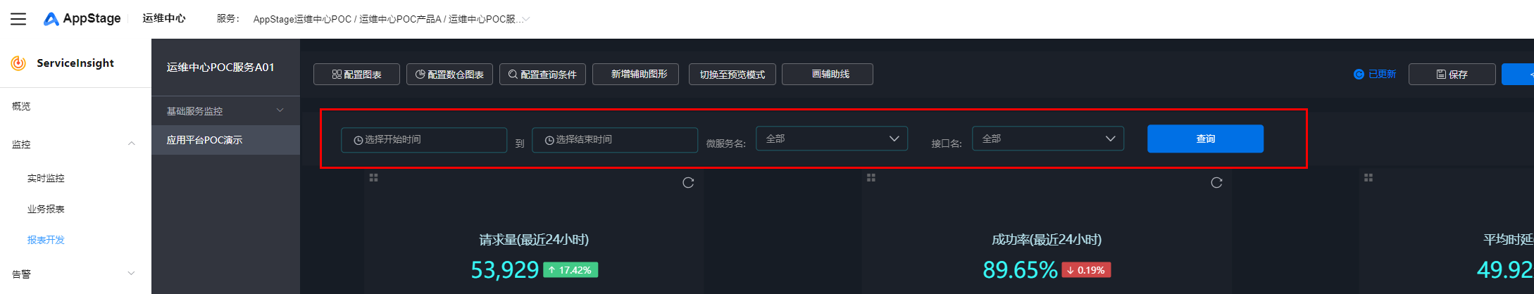 - 选择左侧导航栏的“监控 > 报表开发”,进入步骤十二:创建报表页面中创建的报表“应用平台poc演示”,单击“配置查询条件”。