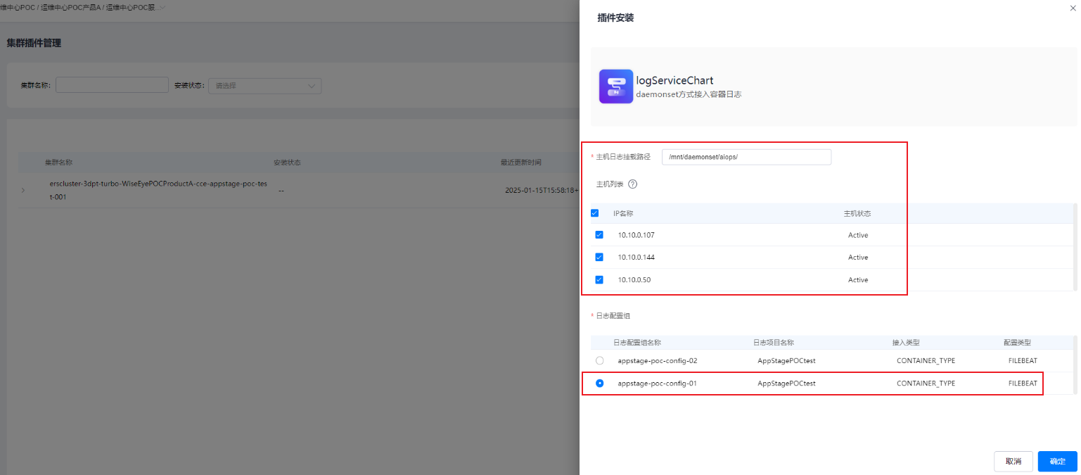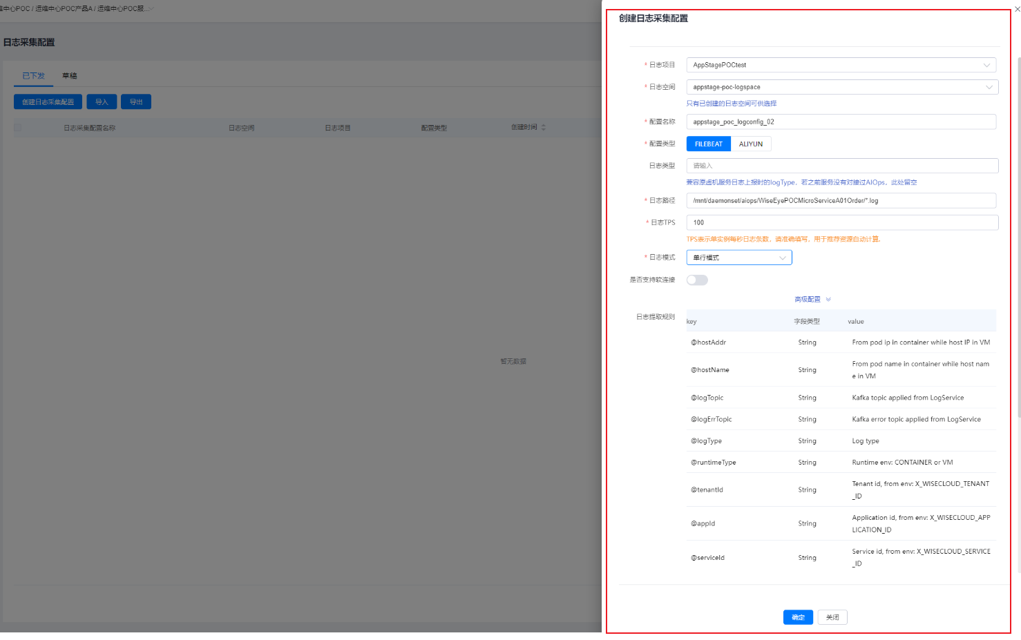 - 单击“创建日志采集配置”,配置日志采集参数,配置完成后,单击“确定”。