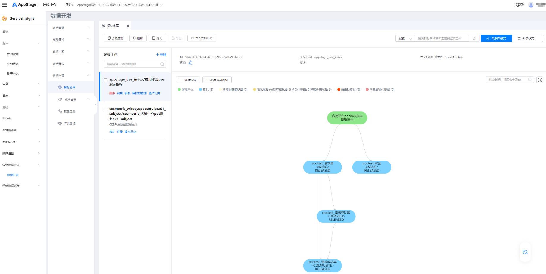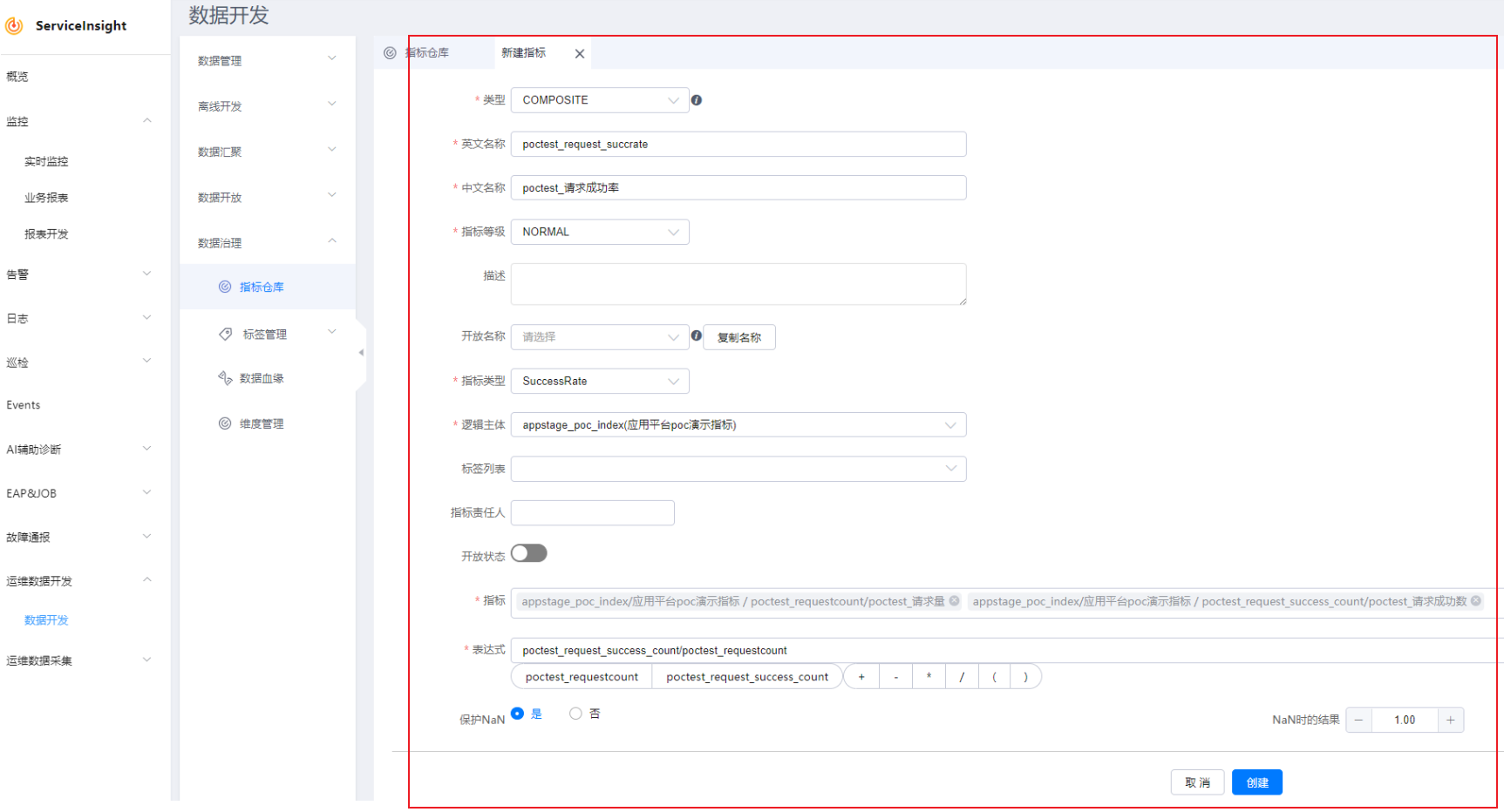 - 单击“添加”,逻辑主体选择步骤八:创建逻辑主体中创建的“appstage_poc_index”,指标选择步骤九:新建指标中创建的“poctest_请求成功率”,数据类型选择“ch”。