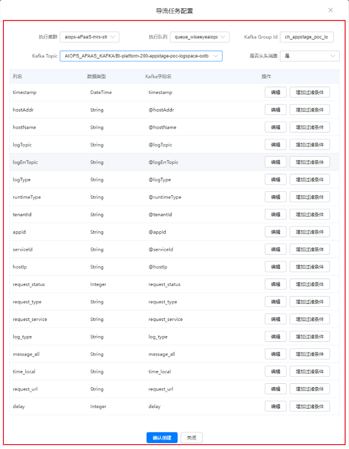 - 如果需要使用日志检索功能,可以打开该开关,并创建导流任务将数据导流至clickhouse表,创建导流任务后可以在“日志检索”页面查看日志。