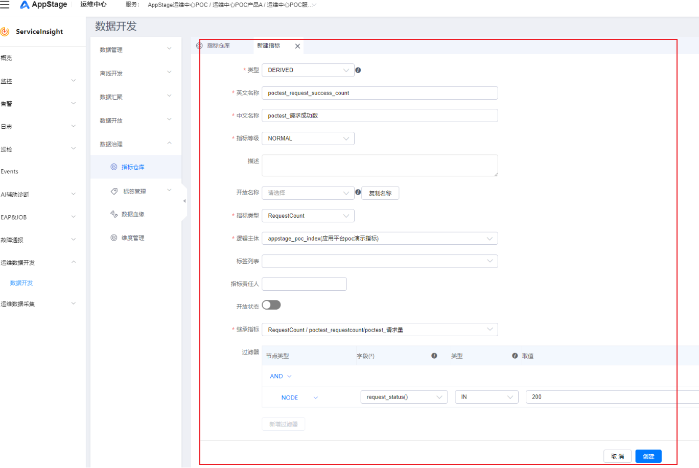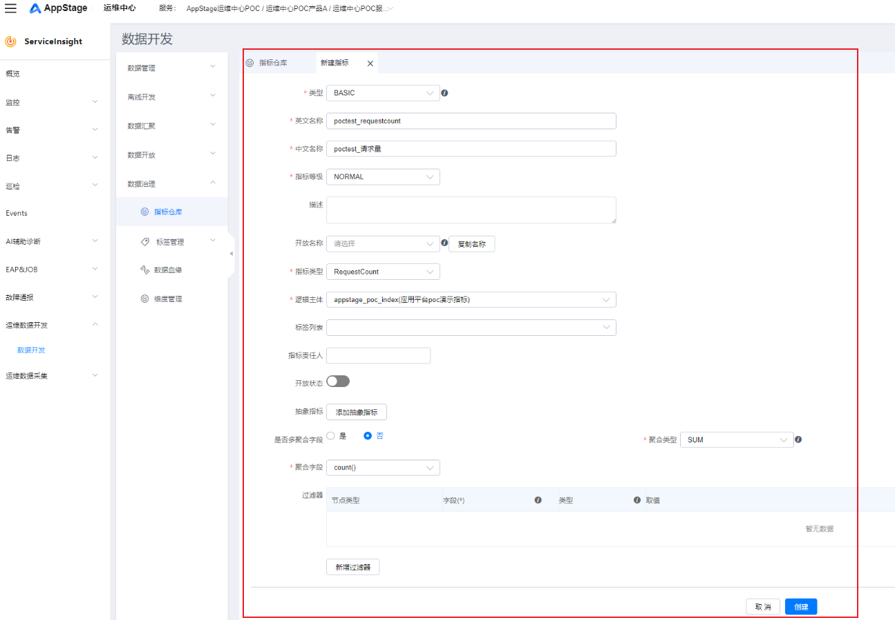- 单击“添加”,逻辑主体选择步骤八:创建逻辑主体中创建的“appstage_poc_index”,指标选择步骤九:新建指标中创建的“poctest_请求量”,数据类型选择“ch”。