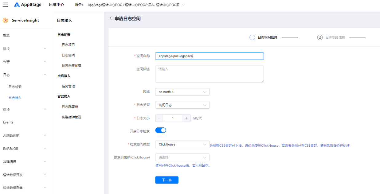 - 根据界面提示填写日志空间参数。
