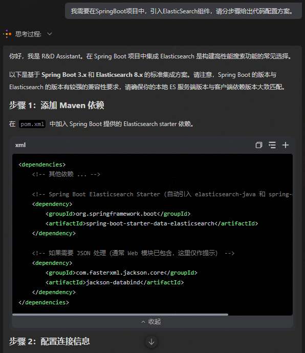 - 在聊天界面的输入框中输入问题描述,如“我需要在springboot项目中,引入elasticsearch组件,请分步骤给出代码配置方案。”