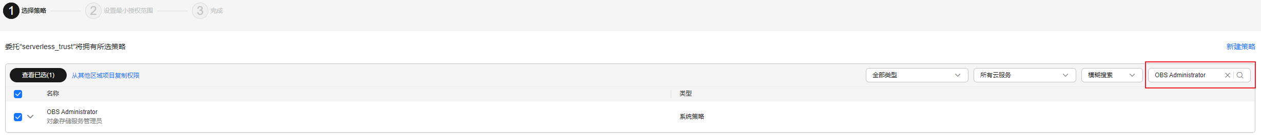 - 在“选择策略”界面搜索并勾选“obs administrator”,单击“下一步”。