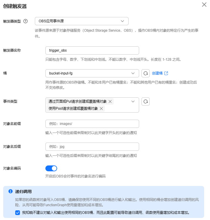 obs桶及函数创建以后,可以为函数添加事件源,添加obs事件源是通过创建obs应用事件源实现的,步骤如下。