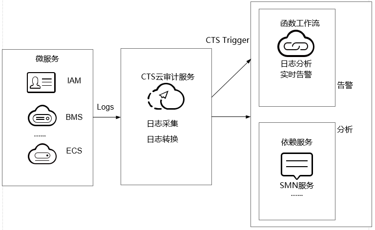 通过在函数工作流服务中创建cts触发器获取订阅的资源操作信息,经由自定义函数对资源操作的信息进行分析和处理,产生告警日志。