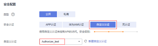 - 自定义认证:选择上述操作中创建的自定义认证“authorizer_test”。