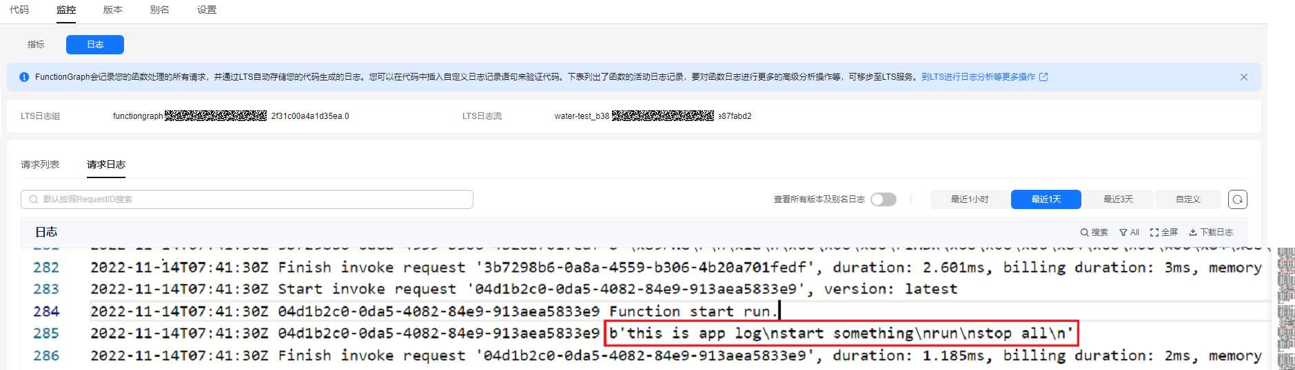 在upload-file-1函数详情页面的“监控”页签下,查看日志,可看到文件内容的打印。实际业务中,用户可根据需要修改代码保存数据到对象存储obs、日志服务lts等云服务或直接处理。