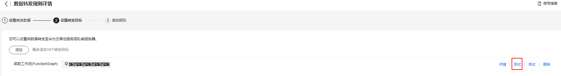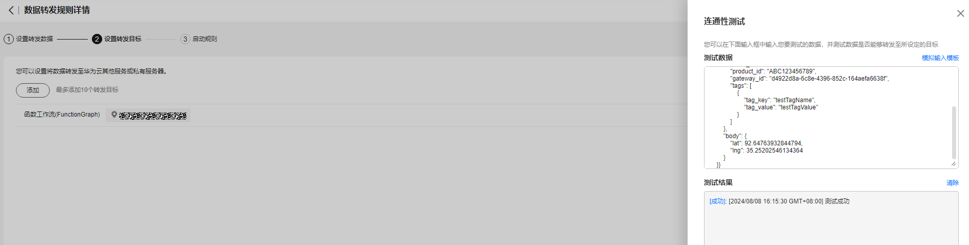 - 选择“设置转发目标”,并单击转发目标所在行右侧的“测试”,开始编辑测试数据。
