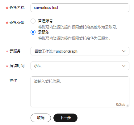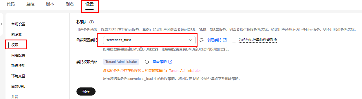 单击刚才创建好的函数mfa-service-serverless,在设置->权限中配置,选择刚才创建好的serverless-trust,如图6所示,单击“保存”确认。