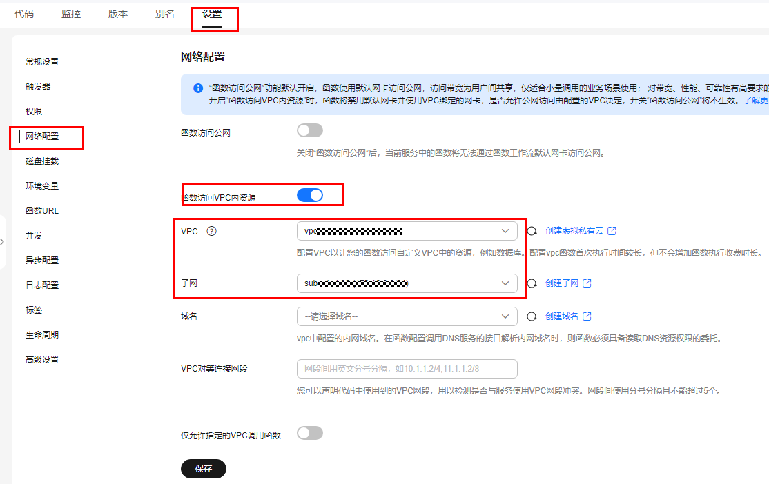 在函数设置页面中,选择网络配置菜单,用户需要选择和后端服务相同的vpc和子网,如图7所示,单击“保存”确认。