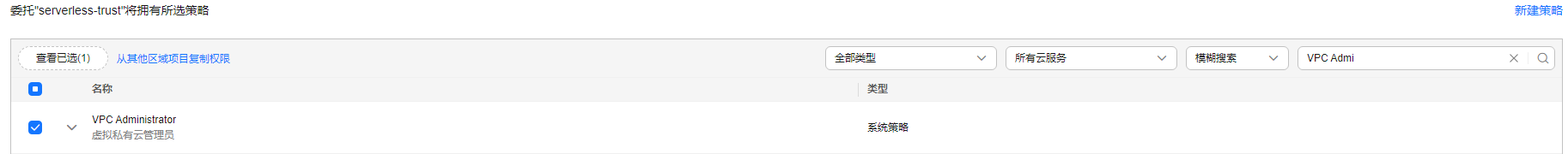 - 单击“下一步”,进入委托选择页面,如图4所示,在右方搜索框中搜索需要添加的权限并勾选。这里使用vpc administrator,最小授权项配置可参考最小授权项配置。
