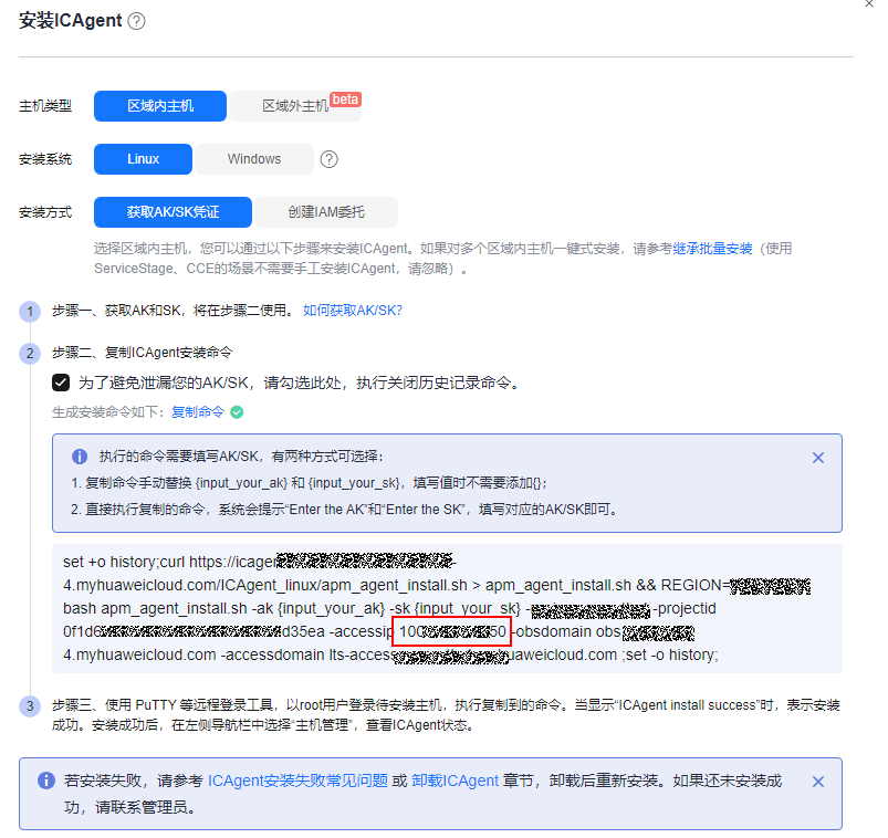 - 在弹出的“安装icagent”窗口中获取接入点ip。