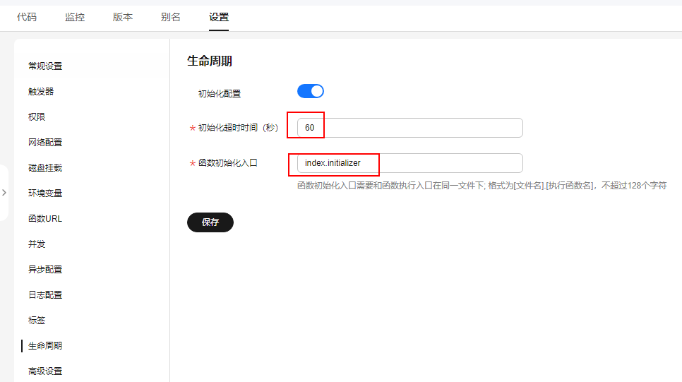 - 选择“设置 > 生命周期”,开启“初始化配置”,设置“初始化超时时间”为“60s”,“函数初始化入口”为index.initializer。