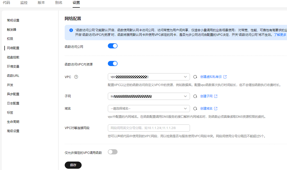 创建函数选择的“区域”与要访问的redis实例所在的区域一致。