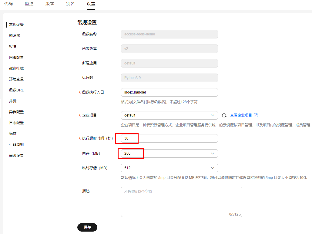 - 在“设置”页签下修改“常规设置”,内存调整为256mb,执行超时时间为30s,然后单击保存。