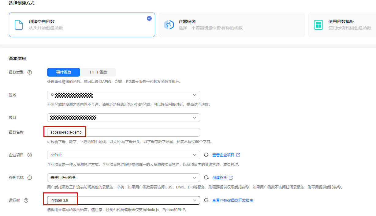 - 选择“创建空白函数”,在创建函数界面配置如下信息:函数类型选择“事件函数”、输入您自定义的函数名称,此处以“access-redis-demo”为例,选择运行时“python3.9”,最后单击创建函数。