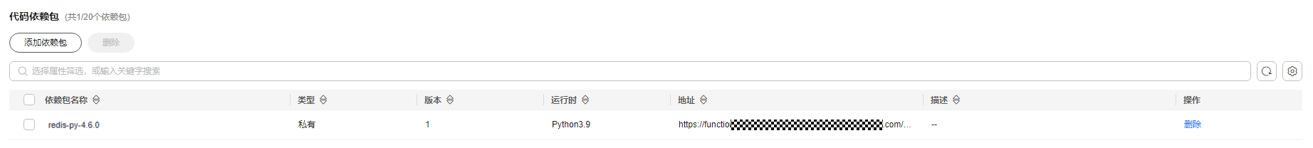 - 在函数代码详情页,单击“添加依赖包”,选择私有依赖包源,添加创建依赖包创建的redis-py-4.6.0依赖包。