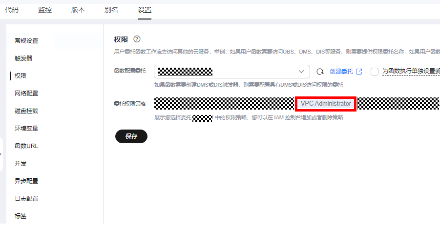 - 在“设置”页签下配置“权限”,添加一个有vpc administrator权限的委托,然后单击保存。