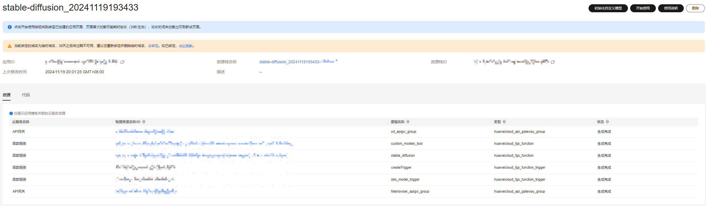 为方便快速体验,应用中心会为您分配一个临时域名,此临时域名仅可用于测试使用,有效期30天。若想开放应用长期访问,需绑定自定义域名,具体部署步骤请参考绑定自定义域名(可选)。图4 应用创建完成