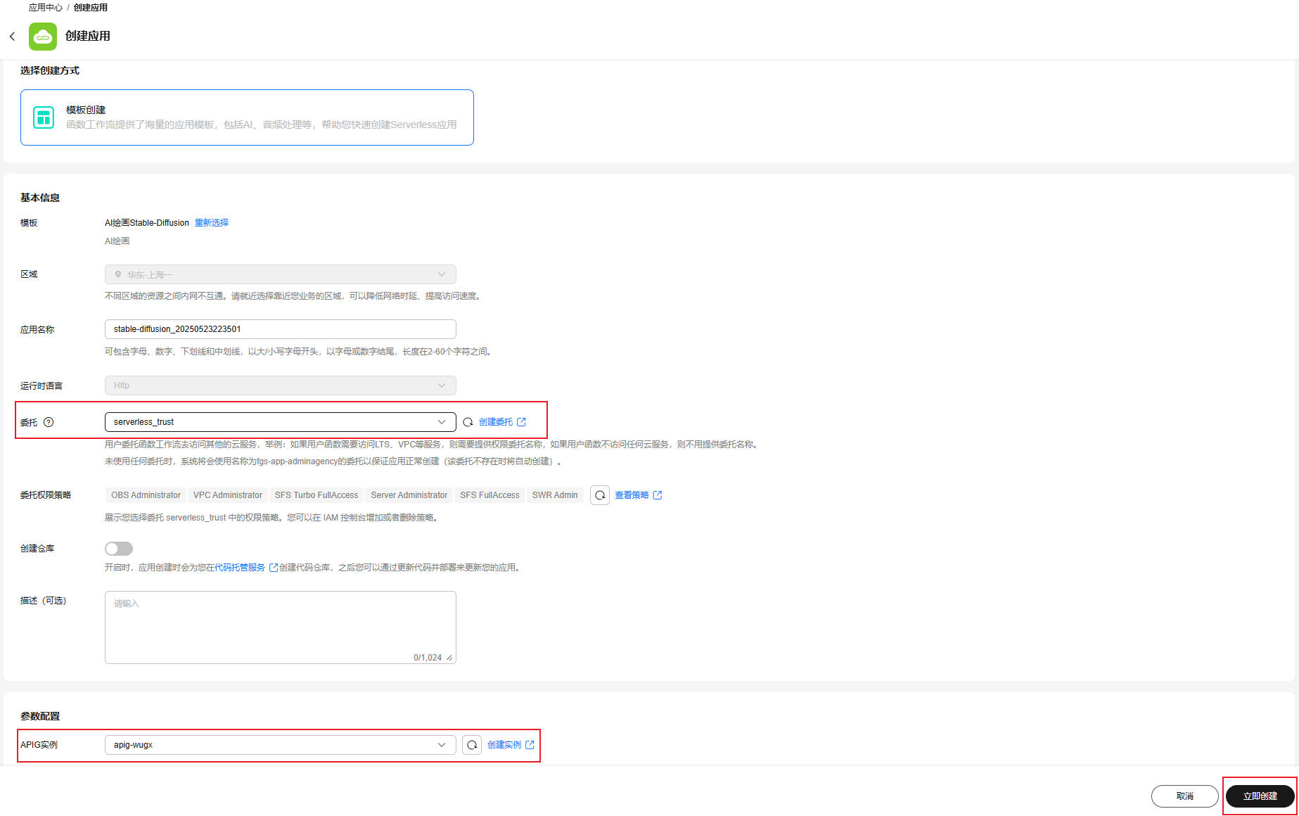 在functiongraph应用中心,使用ai绘画stable-diffusion模板创建应用并配置相关委托,创建成功后即可使用内置默认模型和临时域名进行ai绘画。
