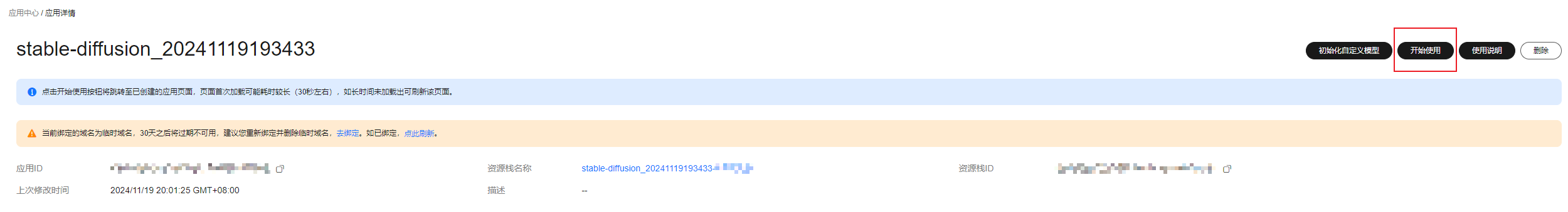 - 如图5所示,单击应用详情界面的“开始使用”,进入stable diffusion webui界面。首次加载冷启动时间会持续30s左右,如遇到加载超时问题,可以通过刷新页面解决。