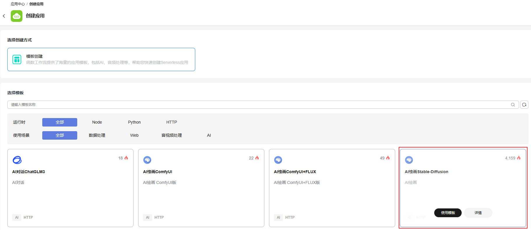 步骤三:使用ai绘画stable-diffusion模板创建应用