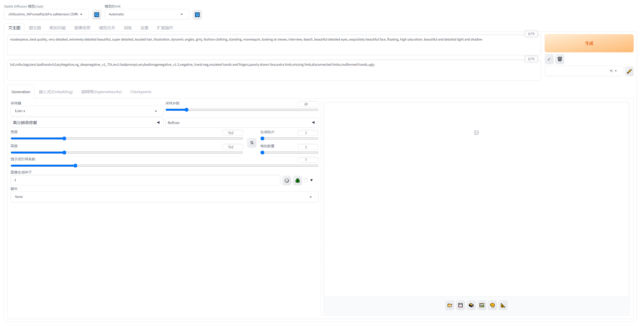 - 在“文生图”标签下,输入相应的提示词和反向提示词(中英文均可),单击右侧的“生成”按钮,即可生成与提示词描述相符的图像。