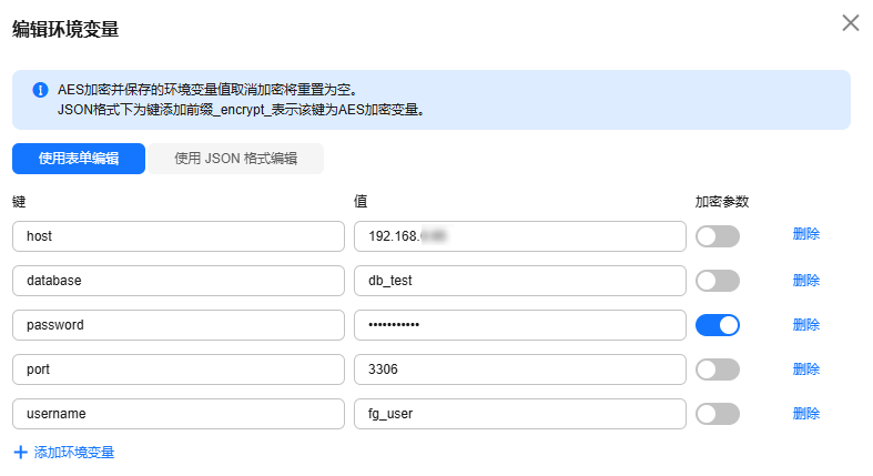 - 如果您选择同vpc内的rds数据库的场景,请将此环境变量值设置为数据库的内网地址。