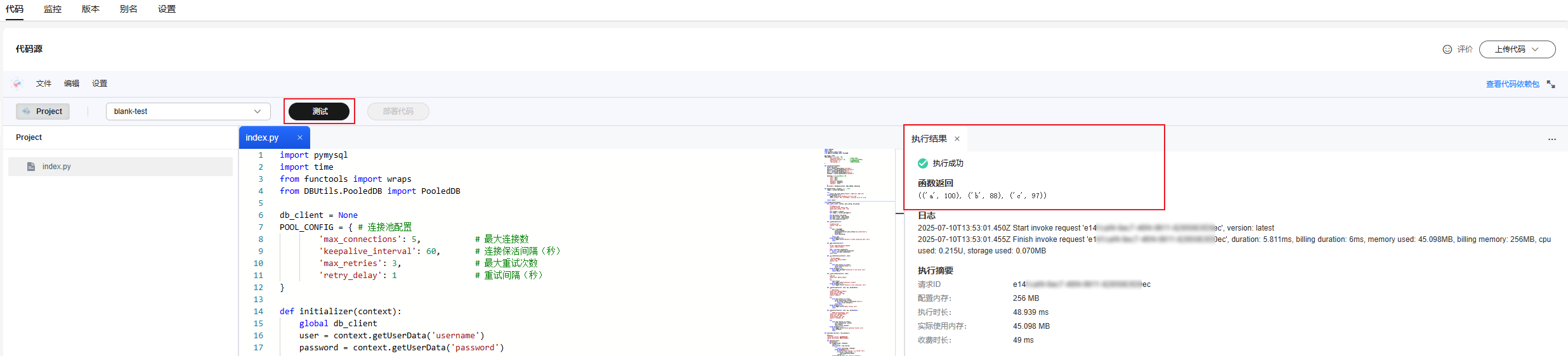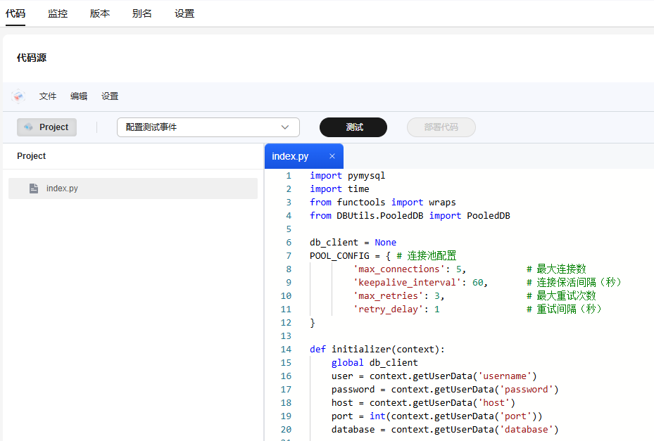- 成功创建函数后进入函数详情页,复制函数访问rds for mysql示例代码,如图4所示粘贴在代码在线编辑器中覆盖“index.py”文件中的代码,单击“部署代码”。