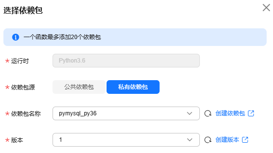 - 在“选择依赖包”弹窗,如图5所示,“依赖包源”选择“私有依赖包”,分别添加步骤一:创建函数依赖包创建的“pymysql_py36”和“dbutils_py36”依赖包。