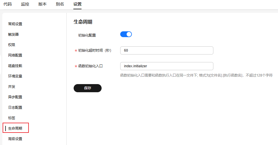 - 在“设置”页签下选择“生命周期”,如图9所示开启初始化配置,设置“初始化超时时间”为“60”,“函数初始化入口”为“index.initializer”,单击“保存”。
