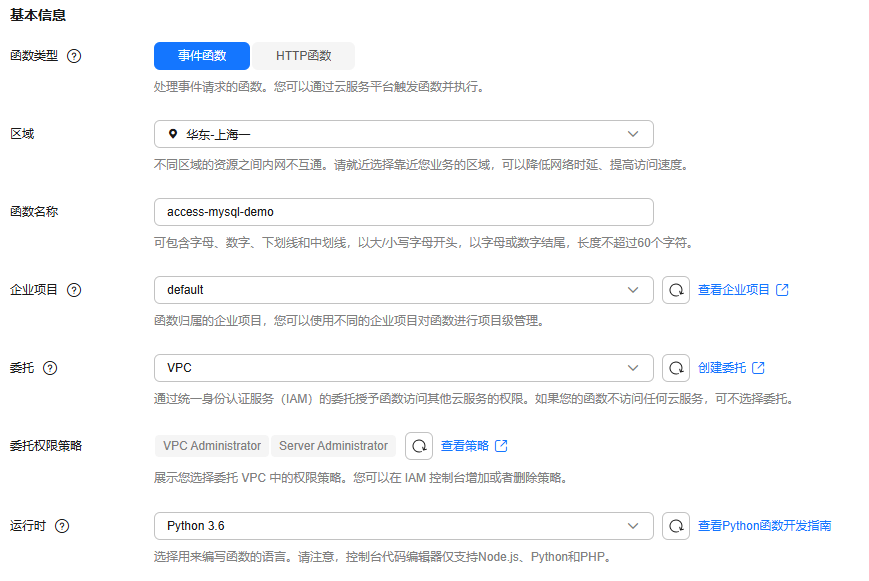 本实践需配置函数访问vpc内资源,因此需选择包含“vpc administrator”权限的委托。
