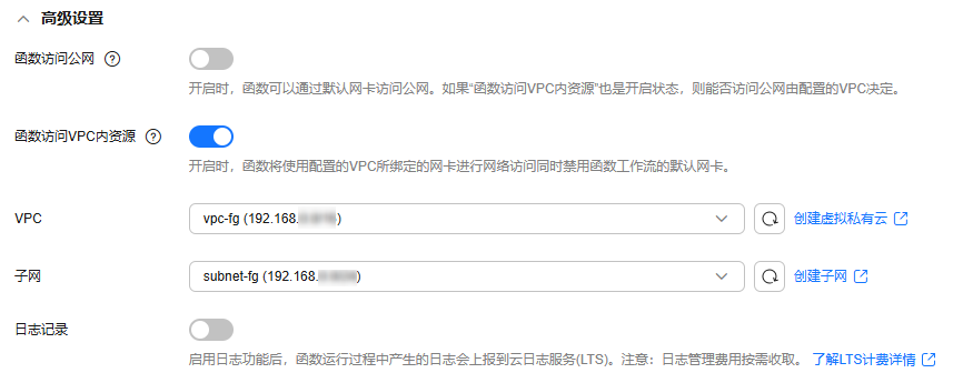 开启时,函数将使用配置的vpc所绑定的网卡进行网络访问,同时禁用函数工作流的默认网卡,即开关“函数访问公网”参数将不生效。