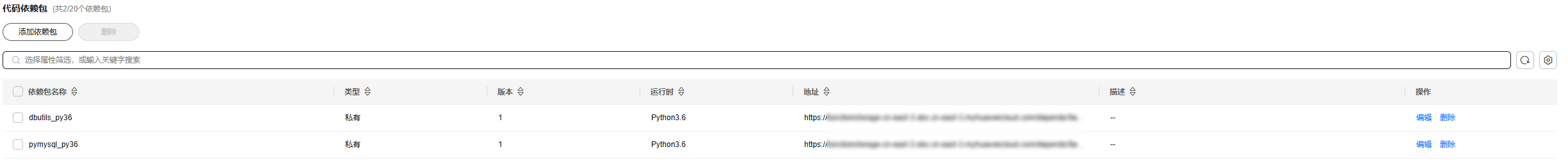 - 单击“创建依赖包”,进入创建依赖包界面,参考表2分别创建“pymysql_py36”和“dbutils_py36”依赖包。