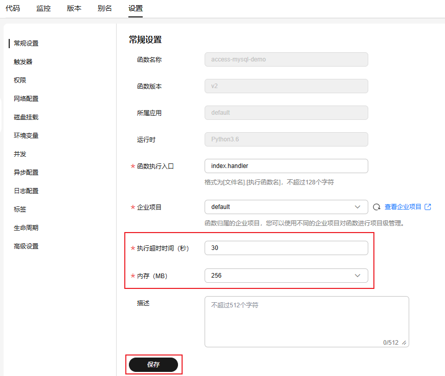 - 单击“设置”页签,选择“常规设置”,调整“执行超时时间”为“30”,“内存”选择“256”,单击“保存”。