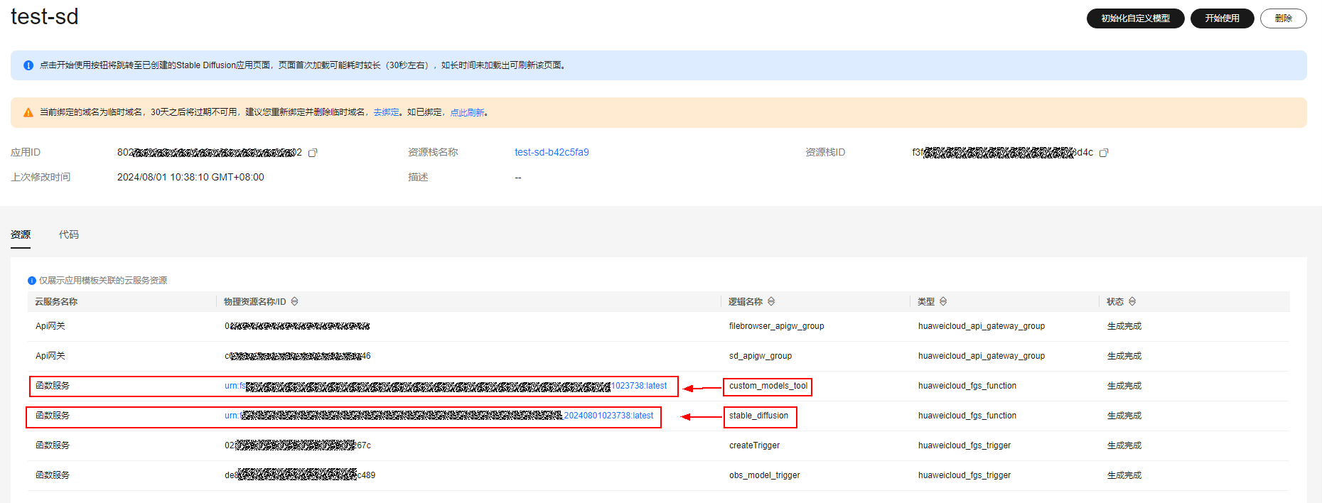 - user1进入应用详情页,在“资源”列表中分别找到逻辑名称为“stable_diffusion”和“custom_models_tool”的函数资源,如图6所示,单击链接进入函数详情页面。