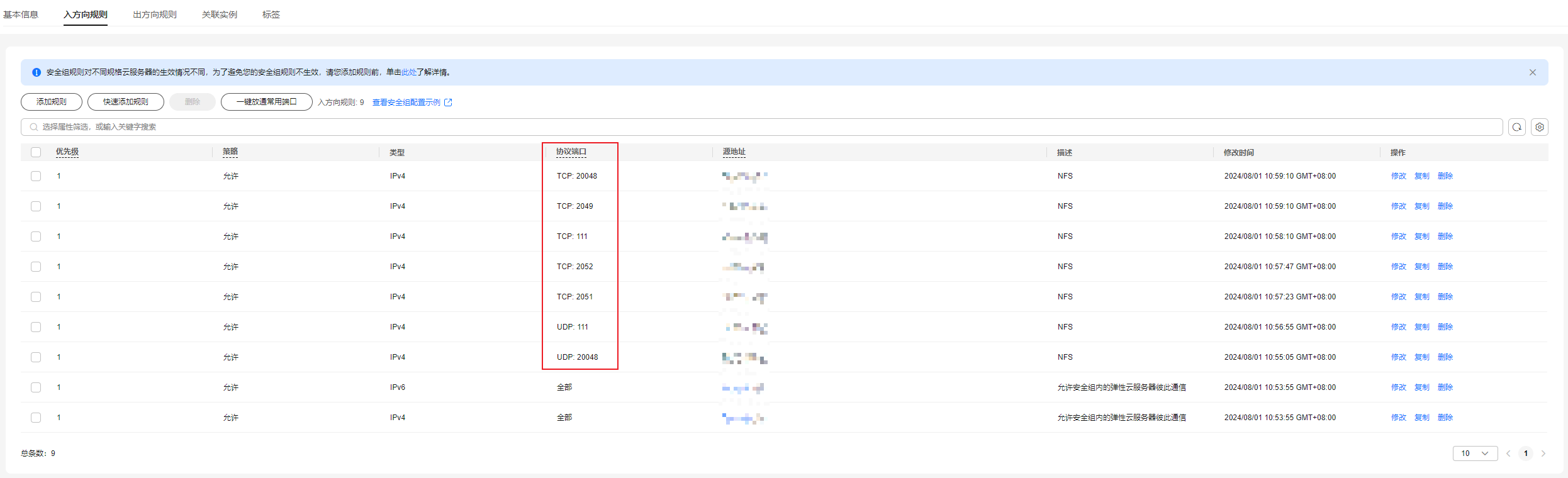 - 安全组:请参考图4新建安全组,入方向规则允许子网内ip访问端口111、2049、2051、2052、20048以支持nfs服务;其他端口,如22端口用于ssh和sftp、21端口用于ftp等,具体协议端口和源地址请根据实际需要配置。